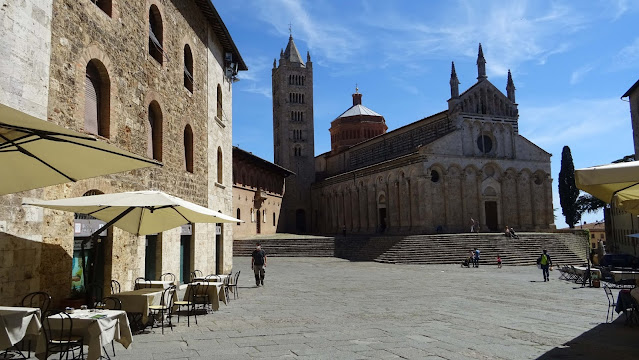 The rest of the irregularly shaped 'square' is occupied by Palazzo del Podestà and Palazzo Comunale as well as the Palazzo Vescovile. From there we wander up one of the narrow streets, past the San Francesco convent towards the Città Nuova from where there are fine views over the Città Vecchia and the surrounding countryside. This is where there is the Torre del Candeliere, which got its name from the fire which was lit at the top. We walk as far as the ex-Clarisse monastery, now a library and then back under the arch near the tower to the main square and the car. Massa Marittima is a small town but well worth a visit. The weather is beautiful, warm and sunny with a breeze, neither hot nor cold.